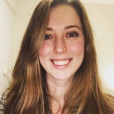 [Image shows Chloe, a white woman, she has long light brown hair and blue eyes, she is smiling in this headshot photograph, she is wearing a white and blue patterned top and her background is plain off-white]