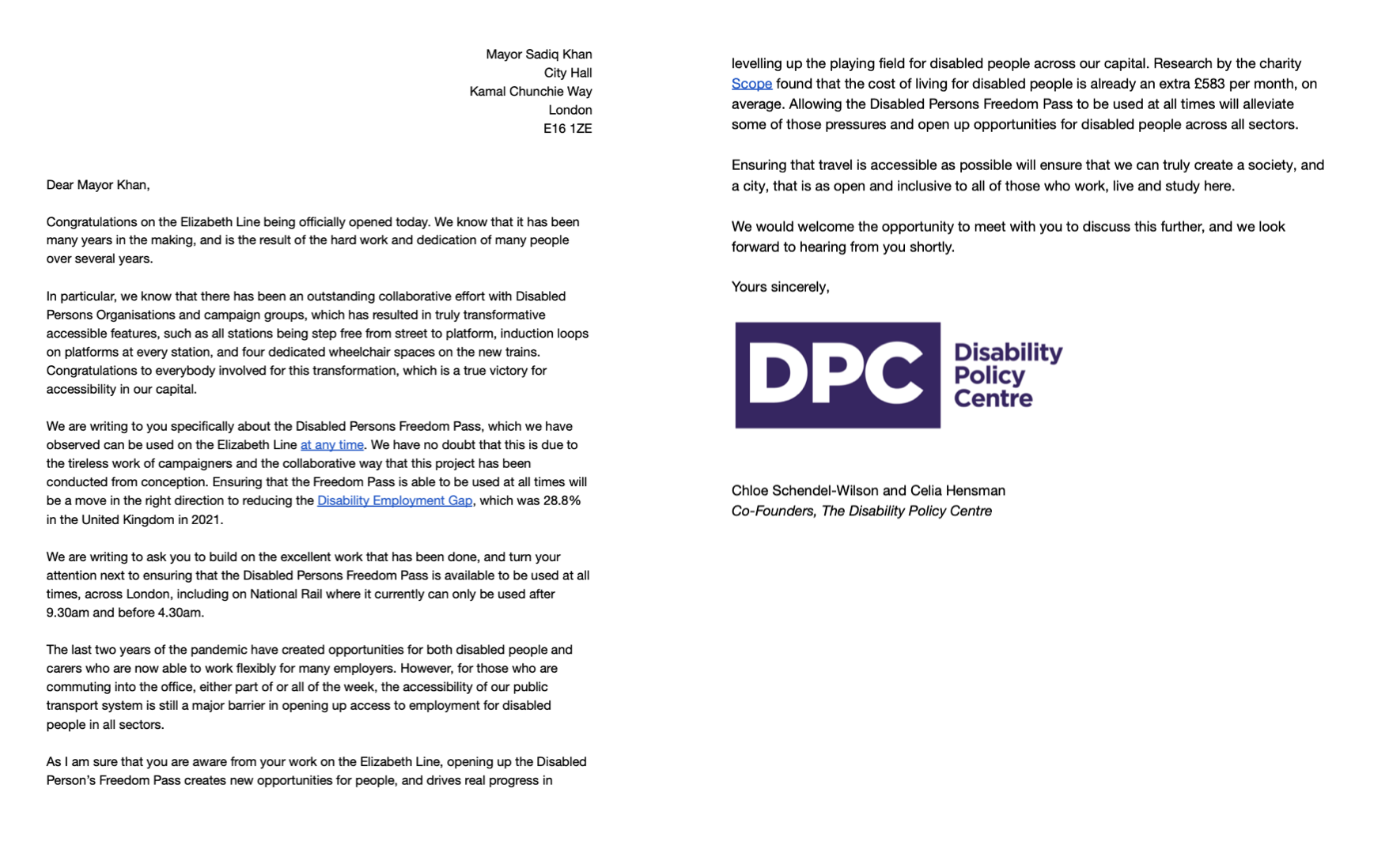 On Tuesday 24th May 2022, on the day of the opening of the Elizabeth Line, The Disability Policy Centre sent a letter to The Mayor of London Sadiq Khan calling for the expansion of The Disabled Persons Freedom Pass to be available to be used at all times, across London, including on National Rail where it currently can only be used after 9.30am and before 4.30am.